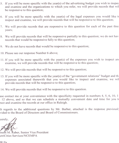It took a month for Ken Raber to respond to our original letter asking for this specific information. In the end, we’re told that if we want it … we can come and get it. The telephone conversation Raber is referring to is my telephone call giving him my address to send this info. In fact, Raber said, “I’m glad you called because this request has been sitting on my desk and I have no address to reply to”. That was 3 days after we asked for it, and Raber said he would get it together. Since then, I guess he put the ElectriCities attorneys to work on figuring a way out.