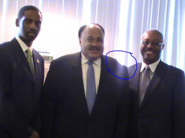 This was a quick photo shot with Andre Knight, Reuben Blackwell and Martin Luther King III. I took many pictures and videos today, but this is one of the most interesting. Take a look at the left shoulder of MLK III, …when I enlarged this pic it really looks like the indention of a hand print…almost as if someone has their hand on his shoulder. The rays of light coming out of this picture are really interesting when looking at the original. I took many pics in the same location, but only this one shows the handprint. The picture below is a copy, so the pixilation isn’t perfect, but you can get an idea of what the original looks like
