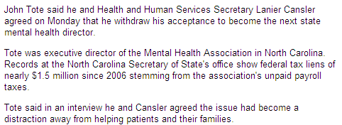 Tote and Cansler agreed that Tote’s federal tax issues had become too much of a distraction. Too much for Tote to run the division of Mental Health and Substance Abuse. Maybe Cansler should re-think his position as Director of DHHS (in the same light of Tote’s decision to step down).