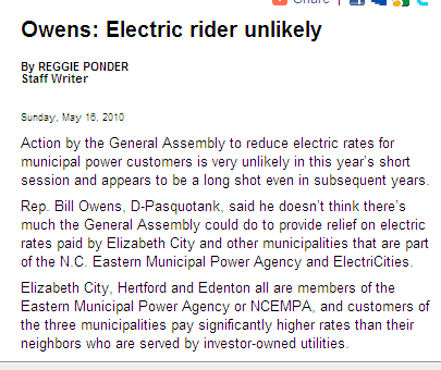 Ratepayers need to remember that we’re (NCEMPA customers) paying, on average, around 7.5 cents per kilowatt hour on the wholesale . That’s just about 2.5 cents under what Progress Energy’s retail rate is currently. As Edwards has said many many times: Progress has 4 million customers while we (NCEMPA) have only about 350,000 customers. When you do the math, the NCEMPA debt is paid by a precious few.
