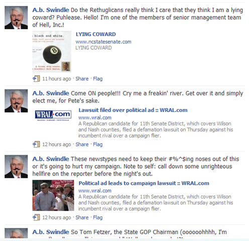 Short Note: Tom Fetzer, and his Tea Party puppet Buck Newton, can’t discuss the issues facing Wilson and Nash Counties, so they have stooped to this: calling Swindell “a lying coward and satanic”.