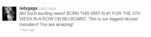 I’m not sure why this is fascinating to me…maybe I’m surprised when famous people get “it” right. Gaga has hit, what I consider, the marketing bull’s-eye for a while now. She continually tweets to her fans and she (or her handlers) does a great job of marketing her image and music.