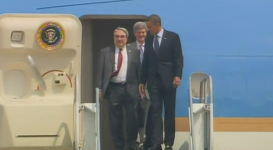 Rep. G. K. Butterfield & President Obama walk off Air Force One together on economic tour.