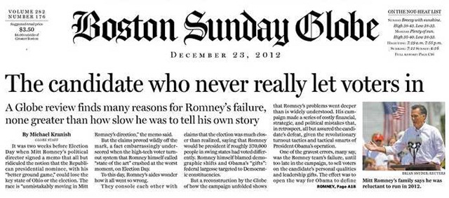 It’s not that Romney never let the voters in to see the the real Mitt as the Boston Globe piece implies. If it were that simple his handlers and media advisors would have picked up on that and fixed it quickly.