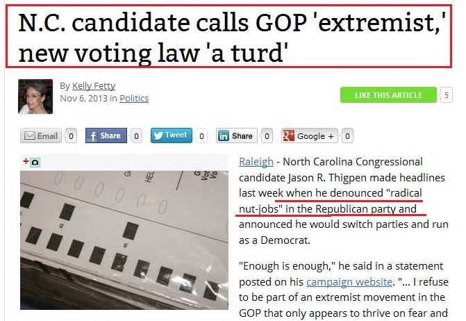 • Another concern I have that Thigpen’s conversion isn’t real is because of timing.  The Republicans have been in control of North Carolina since 2010.  The GOP never made it a secret of their intentions and what they planed to do “to” North Carolina.  Jason remained a Republican for almost 4 years after the GOP took over and it seems  he supported them every step of the way.
