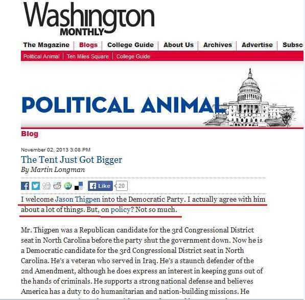 • First off, Jason isn’t running for the North Carolina legislature.  If Thigpen really and truly believed that the Republican’s have gone afoul in Raleigh, and if that’s actually why he became a Democrat; why is he running for Congress?  It would make more sense for him to seek an elected office on the state level.  After all, according to Jason, Raleigh is the real problem.