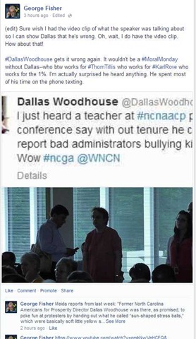 Woodhouse is now going to Moral Monday press conferences and tweeting misinformation about the speakers. He’s hoping one of two things will happen: he’ll be able to disrupt the movement enough so people will get fed up and/or he’ll be able to draw media attention away from the movement and toward his twisted talking points.