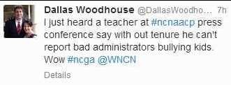 Here’s what Woodhouse tweeted late yesterday afternoon and below that is the actual video of what Woodhouse was tweeting about. –The take-away is that the teacher didn’t say what Dallas Woodhouse quoted.