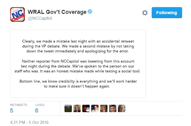 Late yesterday afternoon, the NC Capitol account issued an apology, claiming the tweet was “a mistake” and “accidental”. The apology also claims that “neither reporter from NC Capitol was tweeting that night and it was a member of their “staff” instead.